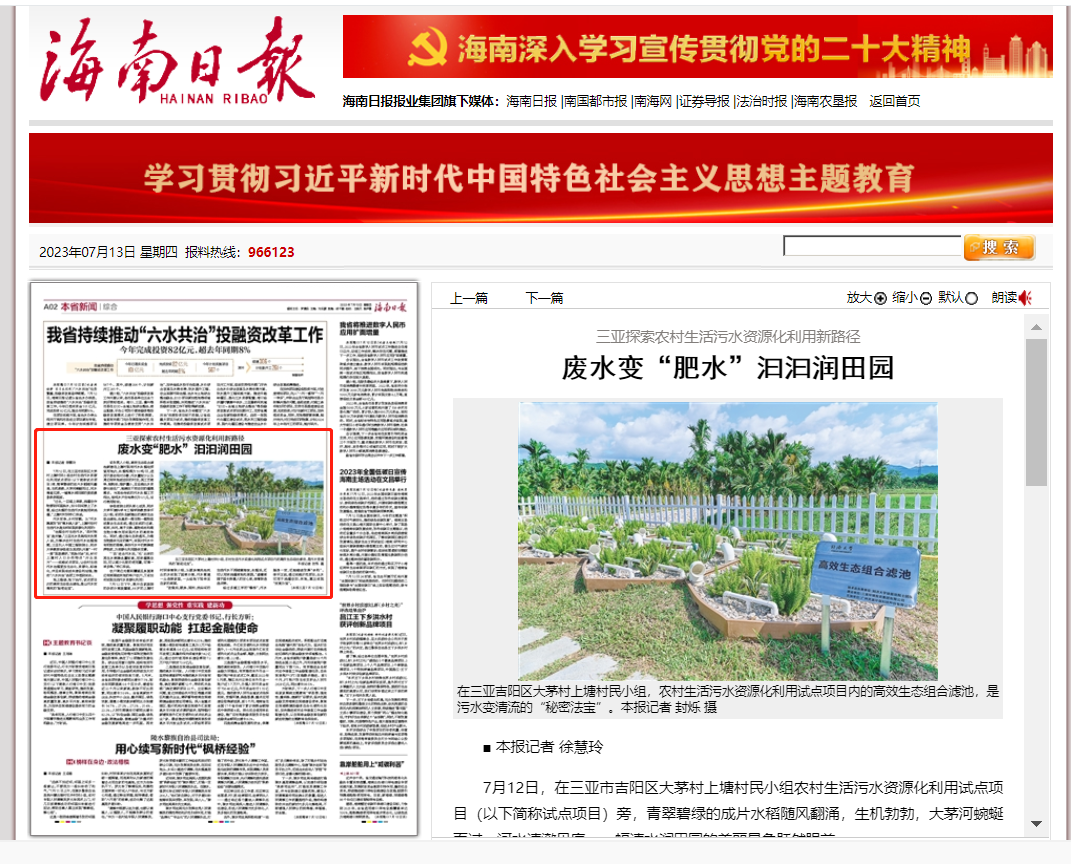 2022年初,海南省委、省政府启动了“六水共治”行动计划,中国工程院院士徐祖信受聘为“六水共治”技术总师,在三亚市建设了农村生活污水资源化利用示范样板工程,引领农污治理生态化、资源化、标准化,并实现低成本建设和运维,为海南全省农村生活污水治理提供了可复制、可推广、可借鉴的综合解决方案。我司作为实施单位参与项目实施。